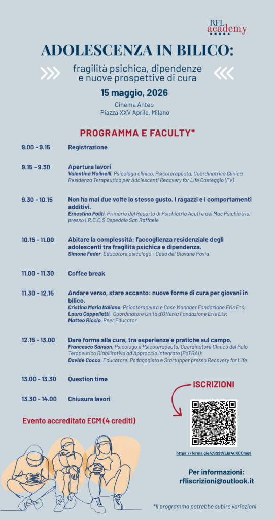 Il seminario è dedicato al tema delle dipendenze che nascono e si sviluppano in adolescenti con fragilità psichiche. In questa area di intersezione si colloca una condizione clinica complessa nella quale disturbi mentali all’esordio e problematiche di dipendenza, sia da sostanze che da comportamenti (alcol, stupefacenti, uso problematico di internet, gaming) tendono a intrecciarsi influenzando in modo significativo il percorso evolutivo del ragazzo e l’equilibrio del sistema familiare.